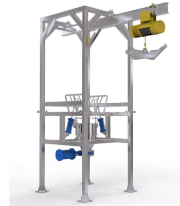 到卸料区上方落下,将包装袋放置在支架托盘上,使大袋处于卸料位置。然后手动打开