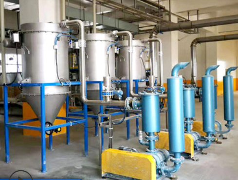 在该系统的开始端约有600m/min的加速度,在末端可达1300m/min的高速,因此气流速度较高。输送管线初端压力一般约0.15Mpa,而末端则与大气压基本接近。稀相输送的介质一般采用空气或氮气,动力提供一般由罗茨真空泵提供。罗茨真空泵的稀相输送时,物料在管道中呈悬浮状态,输送距离达百米,稀相负压的主要特点是可以从低处或散装处多点向高处一点或多点进行输送。